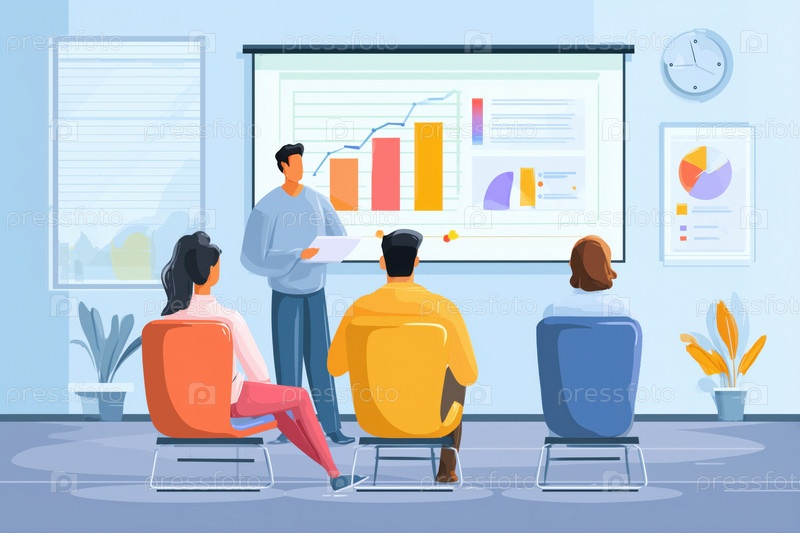 Молодой взрослый человек, представляющий бизнес-аналитику разнообразной команде в офисной обстановке