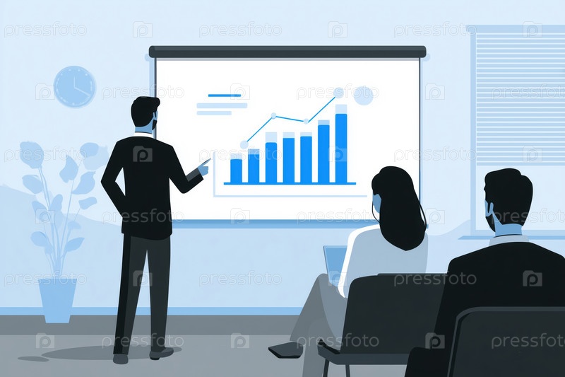 Молодой кавказский мужчина представляет диаграмму роста бизнеса различным коллегам
