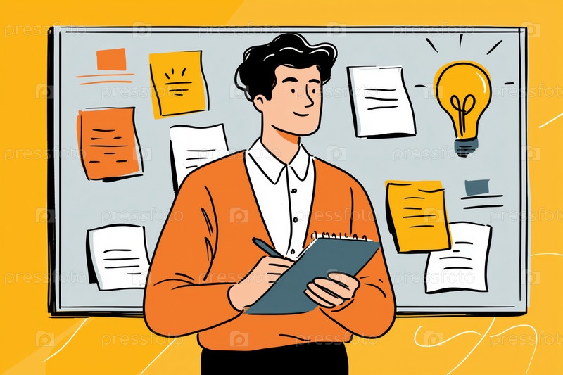 Молодой взрослый кавказский мужчина мозговой штурм идей, в то время как писать на клипборд