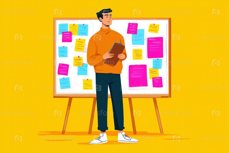 Молодой взрослый кавказский мужчина представляет идеи проекта на борту во время встречи