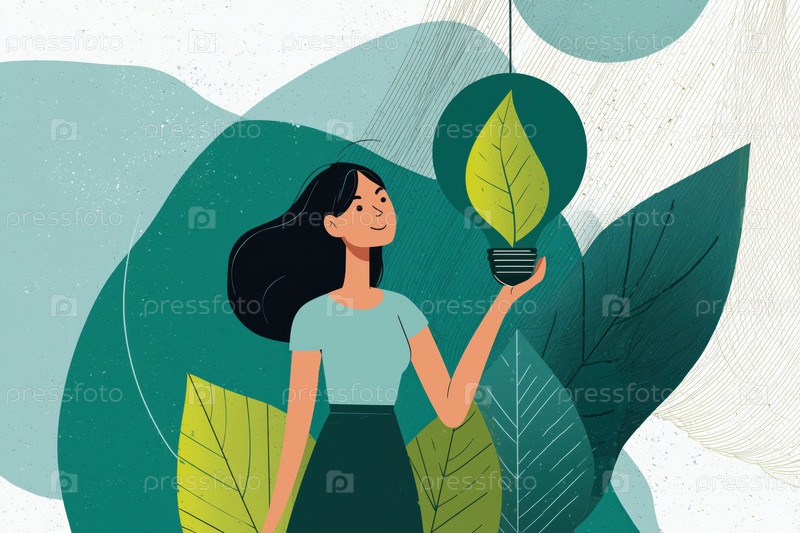 Молодая взрослая кавказская женщина держит растение и улыбается в иллюстрации природы