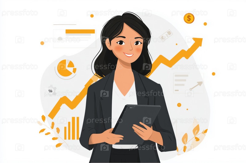 Молодая взрослая азиатская женщина анализирует финансовые данные с помощью иллюстрации цифрового планшета