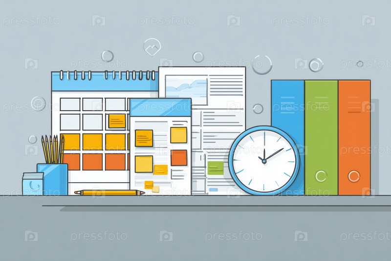 Организация канцелярских принадлежностей и документов с иллюстрацией календаря и часов