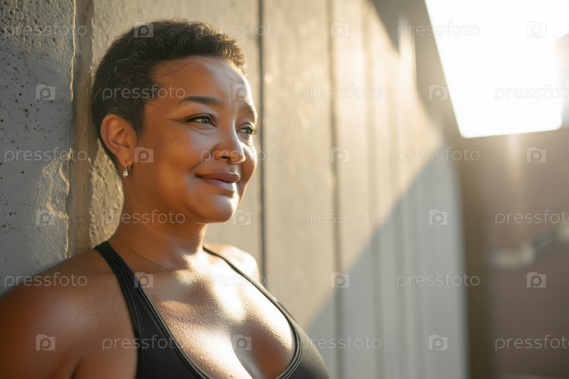 Портрет чернокожей женщины среднего возраста, улыбающейся уверенно на улице при закате