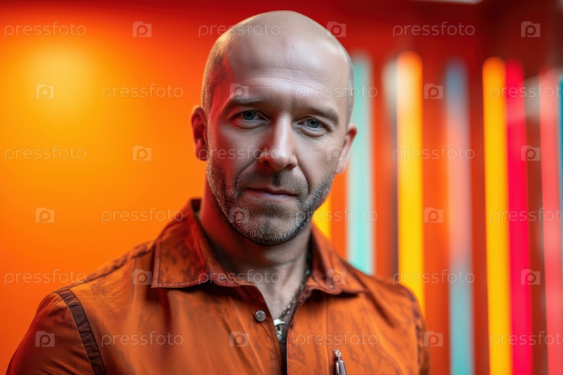 Портрет белого мужчины средних лет, стоящего на ярком красочном фоне