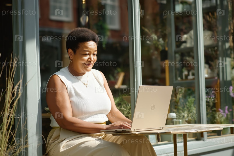 Чернокожая женщина среднего возраста использует ноутбук-компьютер, сидя на улице