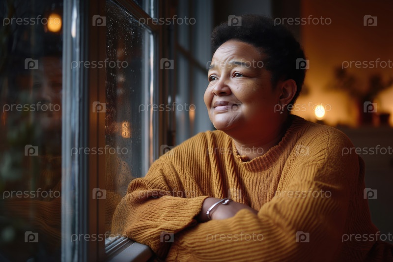 Чернокожая женщина средних лет улыбается, глядя в окно в дождливый день