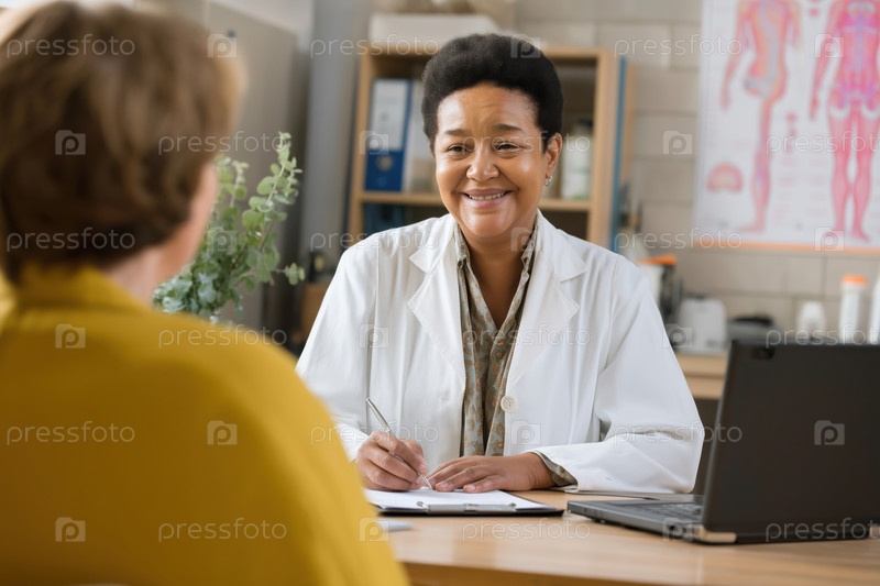 Чернокожая женщина среднего возраста Доктор улыбается, консультируясь со старшей белокурой женщиной
