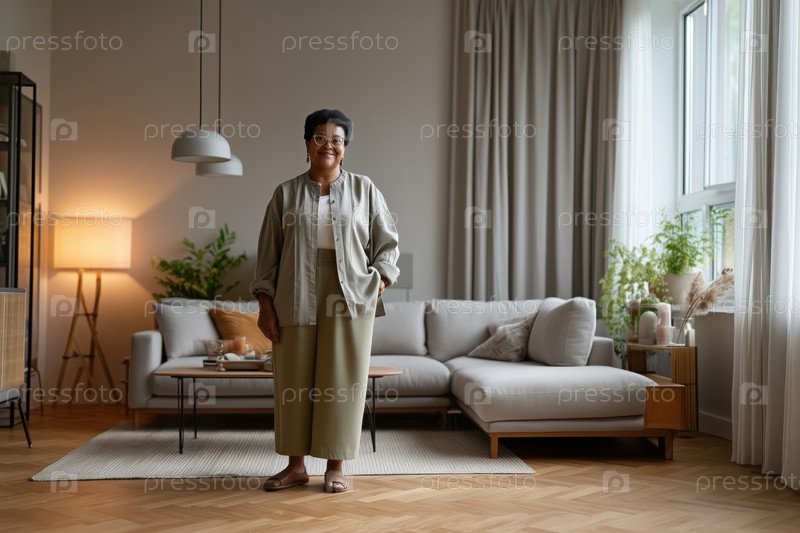 Портрет чернокожей женщины среднего возраста, стоящей и улыбающейся в современной гостиной
