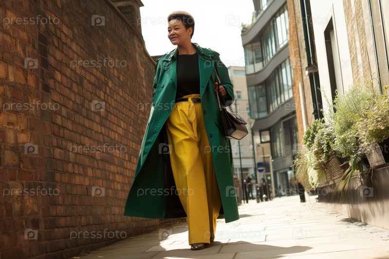 Чернокожая женщина среднего возраста идет по городской улице, улыбаясь уверенно