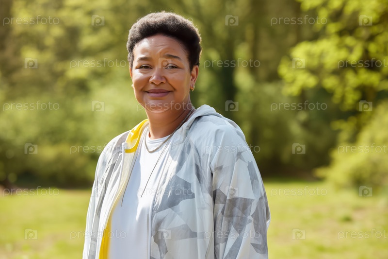 Портрет чернокожей женщины среднего возраста, улыбающейся на улице в естественной обстановке