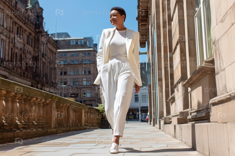 Молодая взрослая черная женщина уверенно идет вдоль улицы городского города