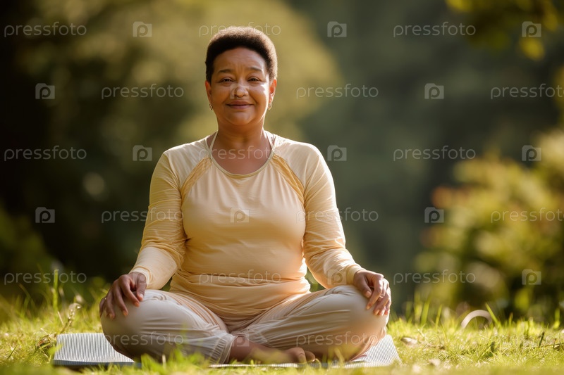 Портрет чернокожей женщины среднего возраста, практикующей йогу на открытом воздухе с улыбкой