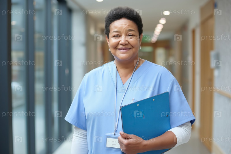Портрет чернокожей женщины среднего возраста медсестры, улыбающейся в то время как она держит клипборд
