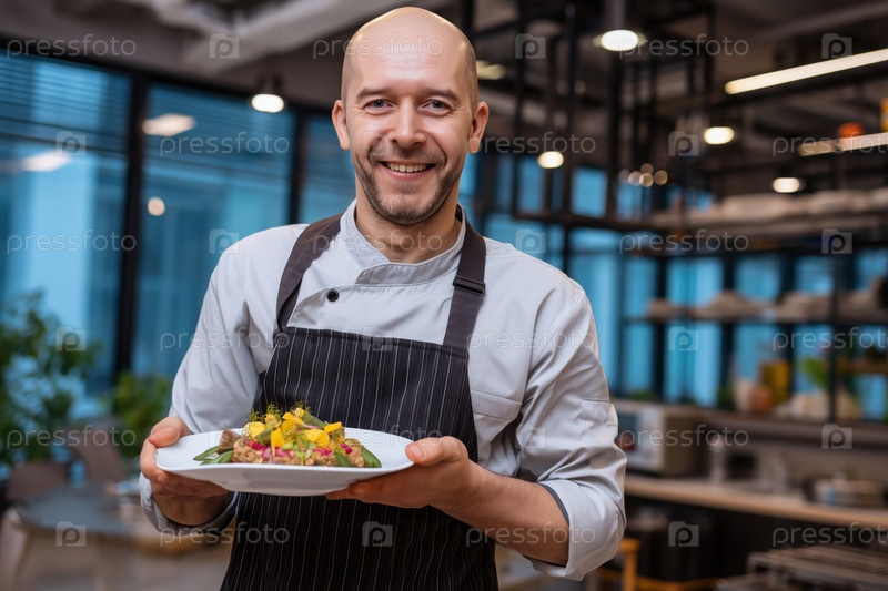 Кавказский мужчина среднего возраста шеф-повар, представляющий гурманское блюдо в современном ресторане