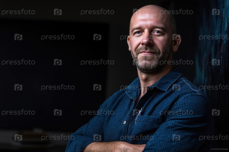 Портрет белого мужчины средних лет, улыбающегося уверенно перед камерой