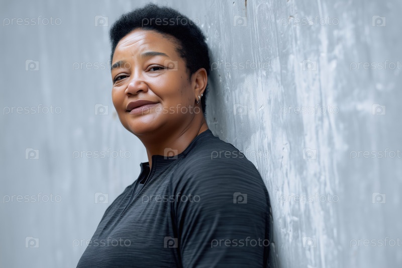 Портрет чернокожей женщины среднего возраста, улыбающейся, прислонившись к стене