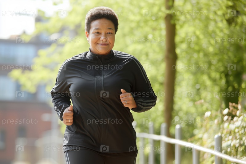 Чернокожая женщина среднего возраста бегает на улице вдоль тропы в городском парке