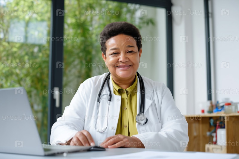 Портрет чернокожей женщины средних лет Доктор улыбается, работая за столом