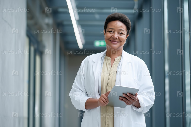 Чернокожая женщина среднего возраста, врач улыбается при использовании цифровых планшетов в помещении