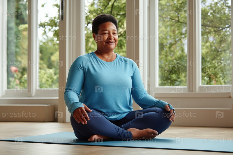 Чернокожая женщина среднего возраста практикует йогу, медитацию в помещении и спокойно улыбается