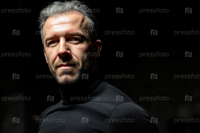 Портрет белого мужчины средних лет, стоящего и отворачивающегося от камеры