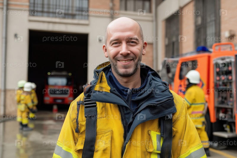 Портрет молодого взрослого белого мужчины, улыбающегося в пожарной форме