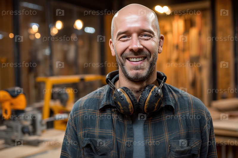 Портрет молодого взрослого белого мужчины, улыбающегося в мастерской по деревообработке