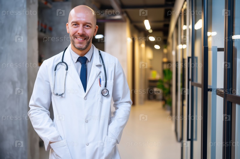 Портрет кавказского мужчины средних лет Доктор улыбается в коридоре больницы