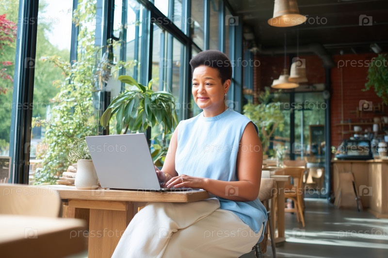 Чернокожая женщина средних лет работает на ноутбуке в современном Bright Cafe
