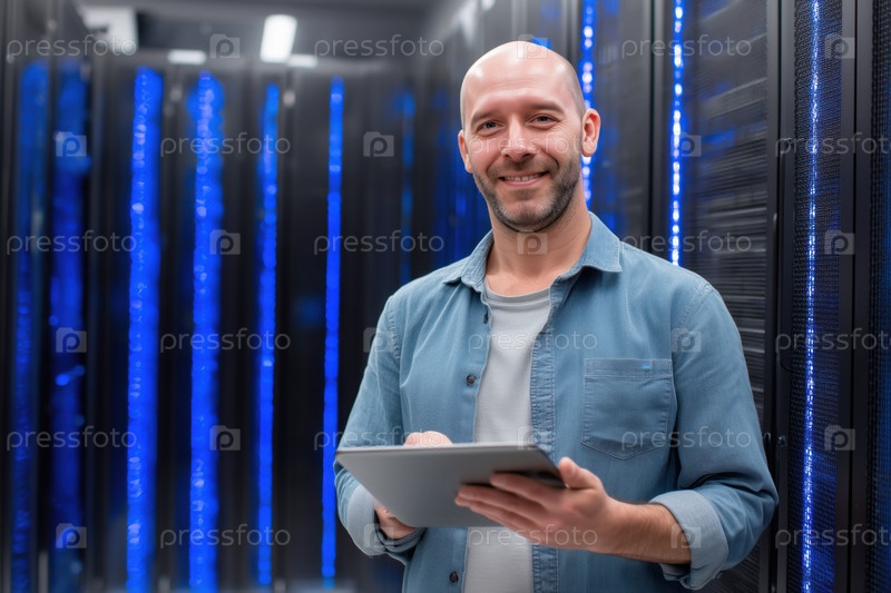 Портрет белого мужчины средних лет, использующего цифровой планшет в центре обработки данных