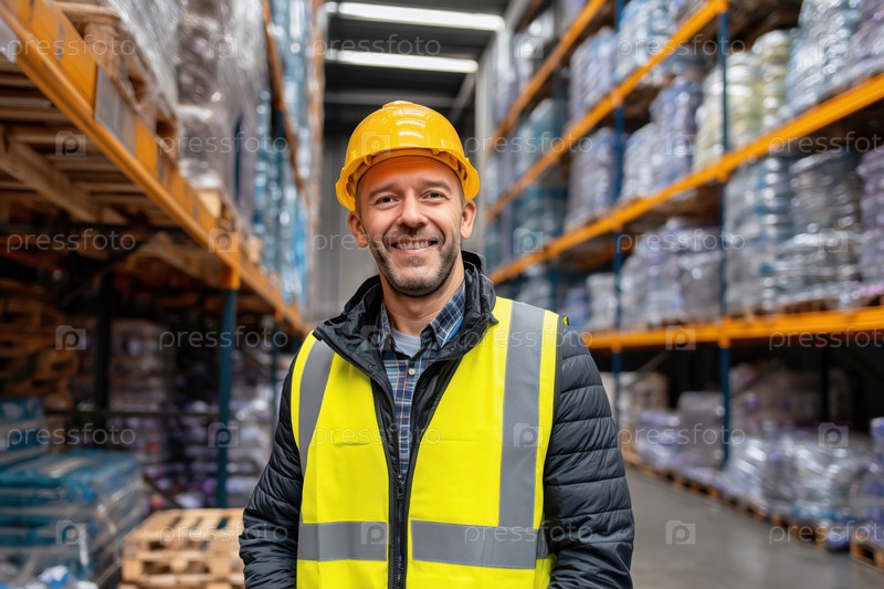 Портрет белого молодого взрослого человека, улыбающегося во время работы на складе