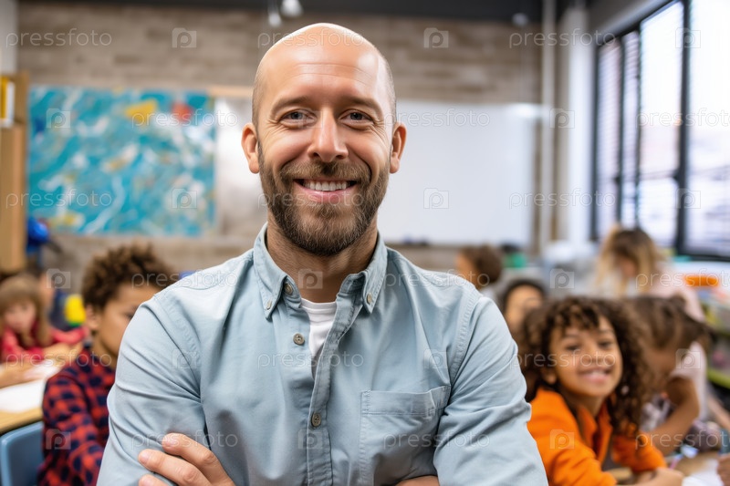 Портрет молодого взрослого белого мужчины, улыбающегося в классе с разными детьми