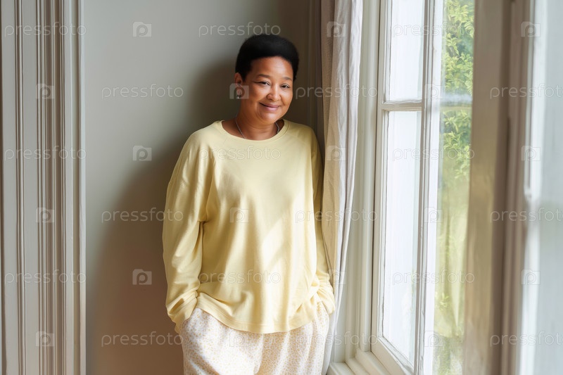 Портрет чернокожей женщины среднего возраста, улыбающейся, стоящей возле окна
