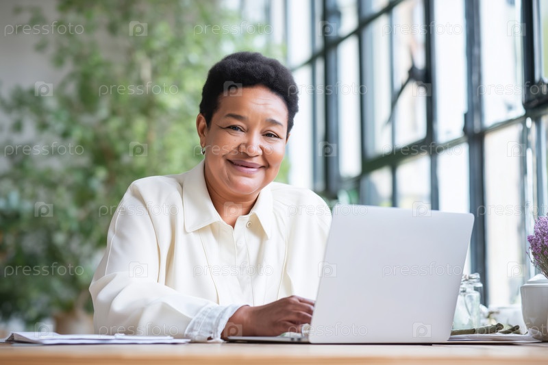 Портрет старшей чернокожей женщины, улыбающейся при использовании ноутбука в ярком рабочем пространстве