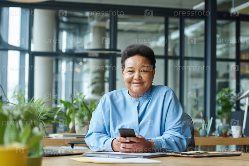 Портрет чернокожей женщины среднего возраста, улыбающейся при использовании смартфона за рабочим столом