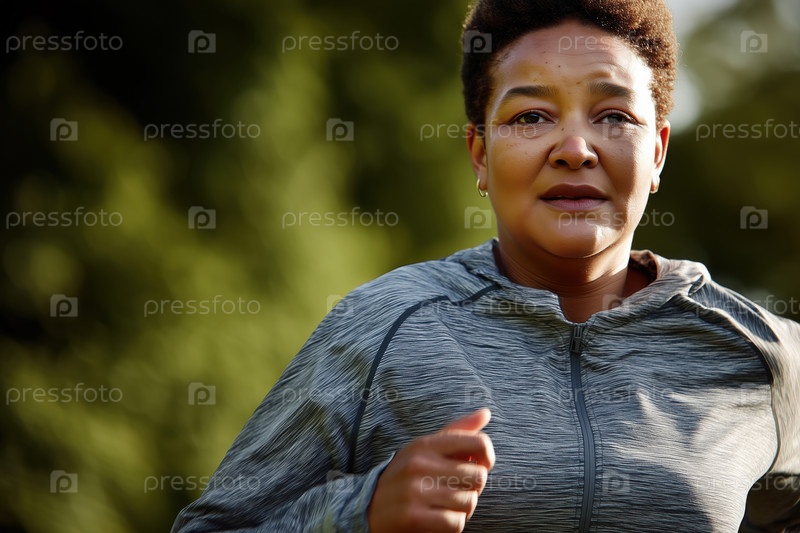 Портрет чернокожей женщины среднего возраста, бегущей на открытом воздухе в естественной среде