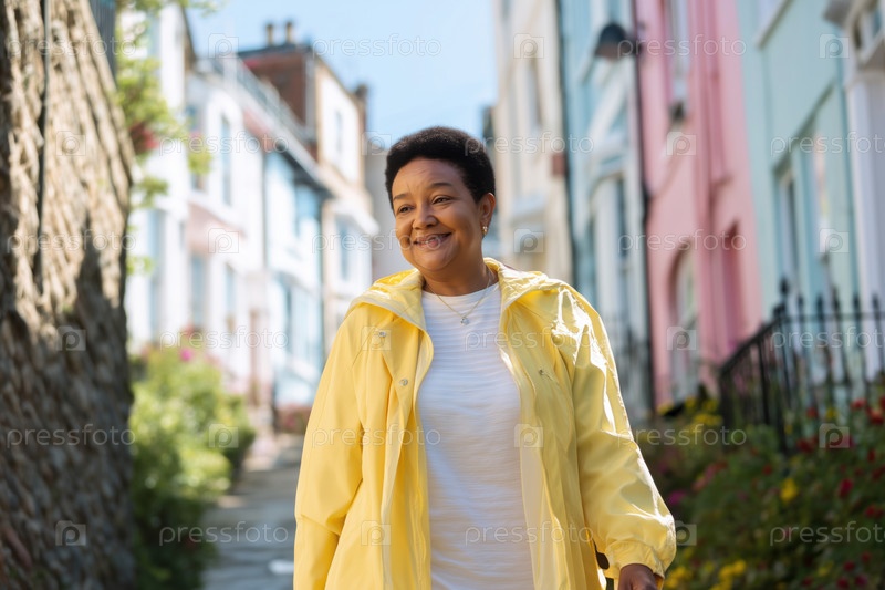 Чернокожая женщина среднего возраста улыбается, когда гуляет на улице в городском районе