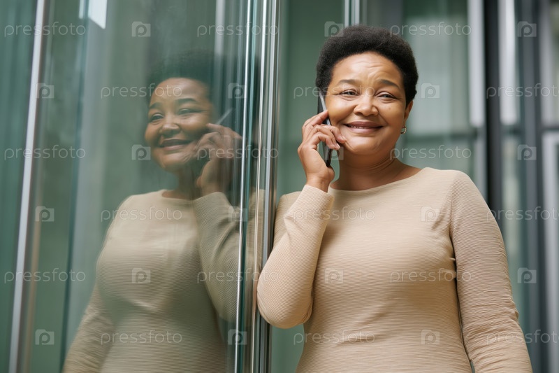 Чернокожая женщина среднего возраста улыбается, разговаривая со смартфоном возле окна
