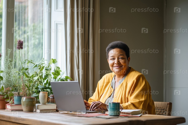 Чернокожая женщина среднего возраста улыбается, работая удаленно рядом с оконными растениями