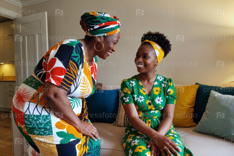 Чернокожая женщина среднего возраста улыбается молодому взрослому черному человеку, сидящему в помещении