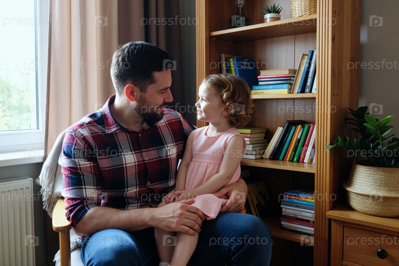 Кавказский молодой взрослый мужчина улыбается белому ребенку девушке, сидящей на коленях