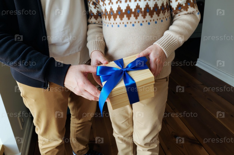 Человек, дающий подарочный ящик с голубой лентой ребенку в помещении