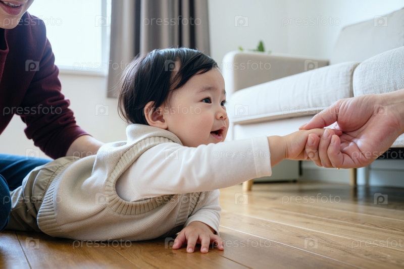 Азиатская девочка-ребенок улыбается, достигая взрослой руки на деревянном полу