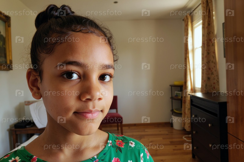 Портрет молодой чернокожей девушки, улыбающейся уверенно в помещении и смотрящей на камеру