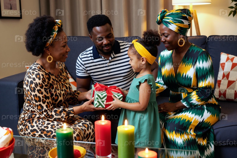 Молодая семья дарит подарки улыбающемуся ребенку во время праздничного торжества