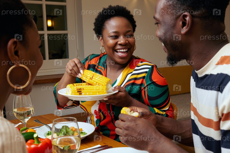 Черная женщина улыбается, подавая жареную кукурузу во время обеда