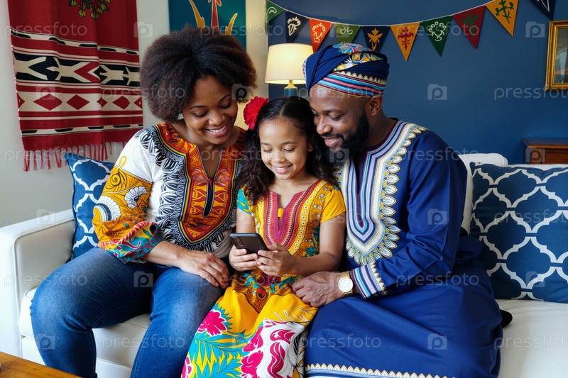 Семья, сидящая вместе и улыбающаяся при использовании смартфона
