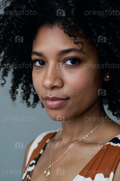 Портрет молодой взрослой чернокожей женщины, улыбающейся уверенно перед камерой