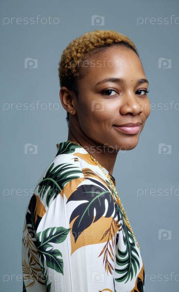 Портрет молодой взрослой чернокожей женщины, улыбающейся и смотрящей через плечо